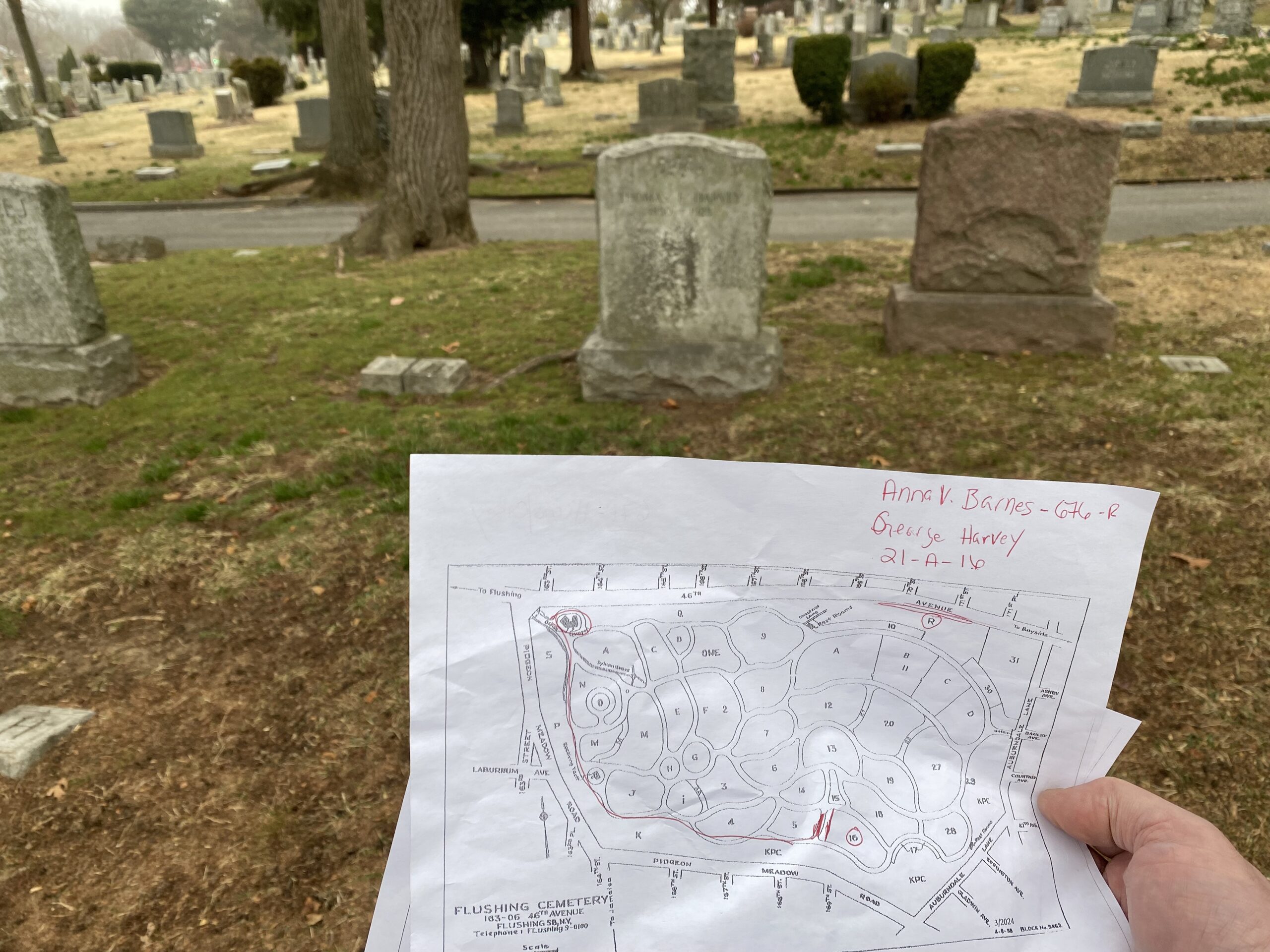 FindAGrave did not have a picture of her grave at Flushing Cemetery, nor was there any sense that anyone had visited her page. She had no heirs. No flowers, no tribute or anything. Since I was going to be near there on successive weekends for my son’s baseball workouts at Game162, I thought I’d snap a photo of the grave of Anna Barnes, once a well known figure in Queens Republican circles during the Depression, but now lost to time and without even a photo of her grave. A photo of her grave would be my first contribution on that website. The person working at the desk gave me a map indicating the area where her grave was located. It seemed simple enough.